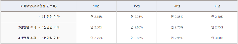- 대출 신청인과 배우자의 합산 총 소득이 연간 6천만원 이하인자 (생애최초주택구입자, 신혼가구, 다자녀가구, 2자녀 가구는 연간 7천만원)