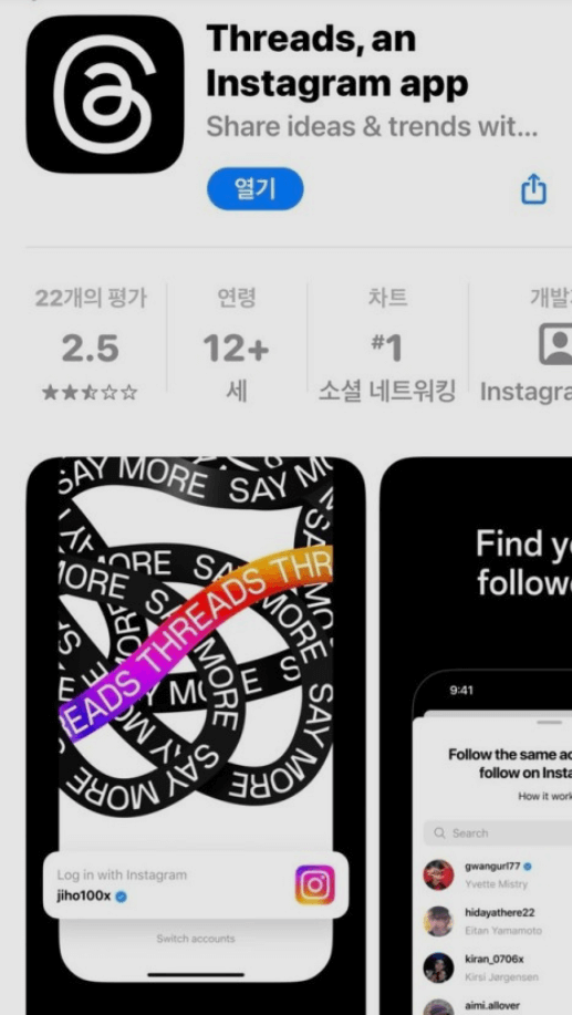 1. 핸드폰 앱스토어에서 Threads 혹은 한글로 '쓰레드' 를 검색합니다.